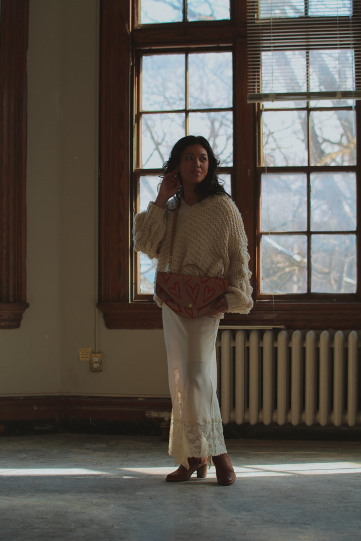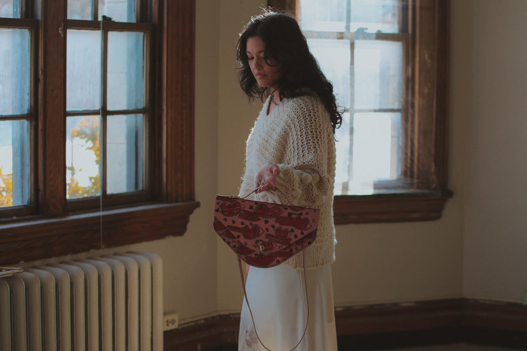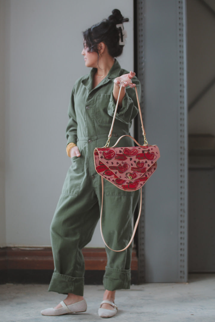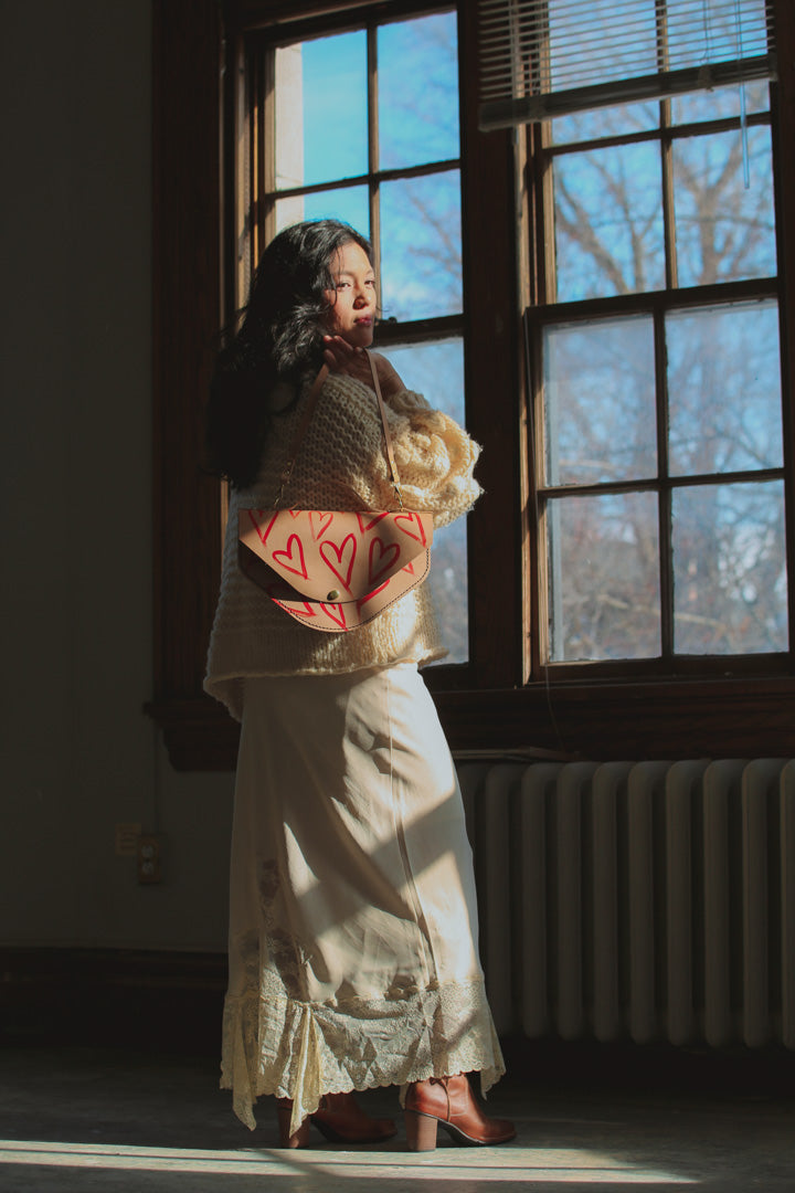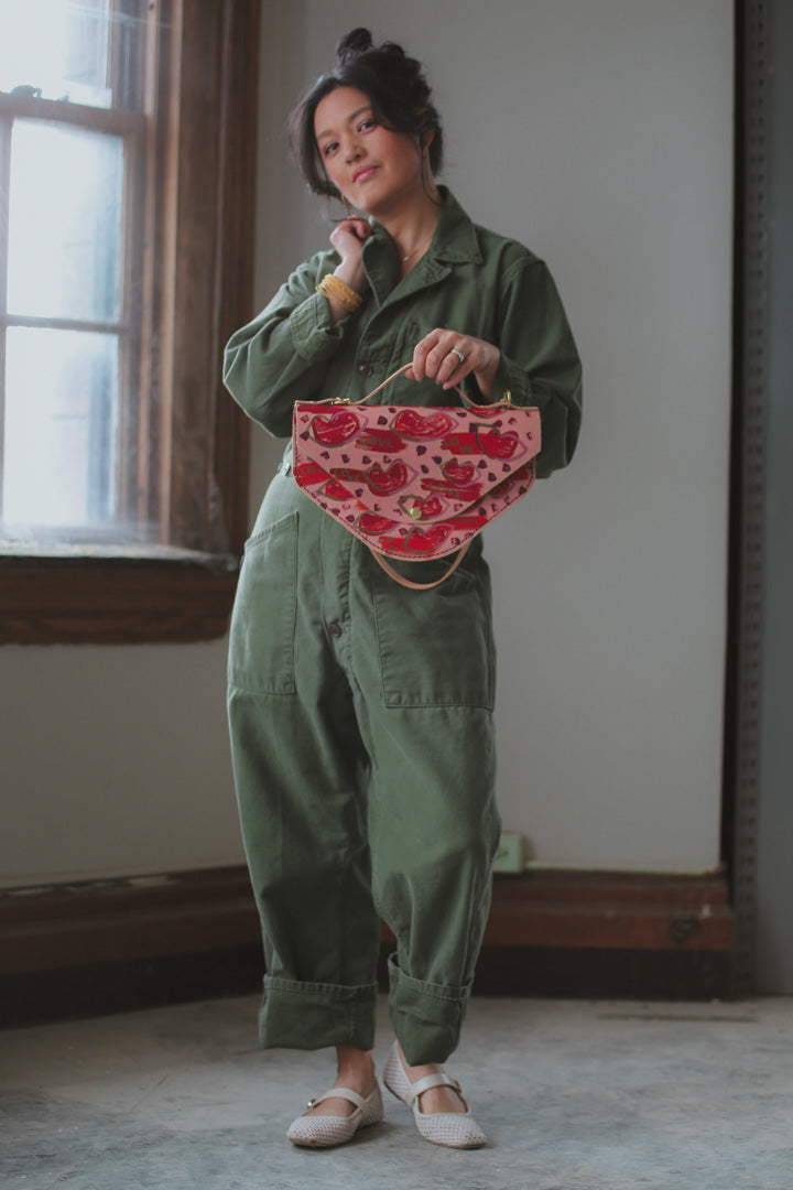 This uniquely shaped bag draws inspiration from a plate I discovered in the studio over a decade ago, now reimagined through abstract, love-inspired designs for our Valentine’s collection. It celebrates playful experimentation and creative freedom, reminding us that the most meaningful designs often begin with a simple moment of joy.